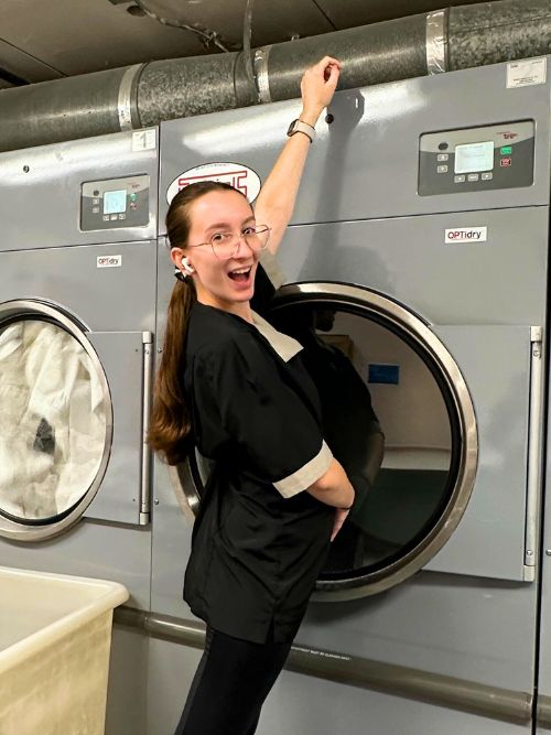 Включва изцяло работа с перални машини в хотели или ресторанти – зареждане, разтоварване, слагане на чаршафи и кърпи на машините за гладене и др.